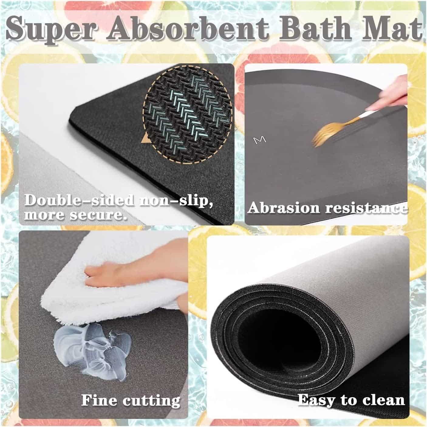 The mat features a soft, absorbent texture that quickly soaks up water and helps keep floors dry. Its anti-skid backing ensures stability on smooth bathroom floors, making it suitable for daily use near showers, bathtubs, and wash basins.