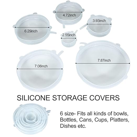 Keep your food fresh and covered with the Zilotyshopping Silicone Lid Set (6 Pcs). These stretchable, reusable silicone lids fit securely over bowls, cups, plates, and containers of various sizes, creating an airtight seal to help preserve freshness.